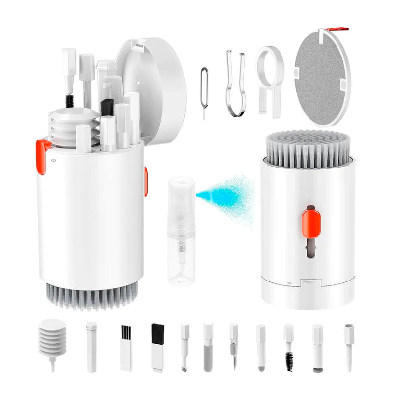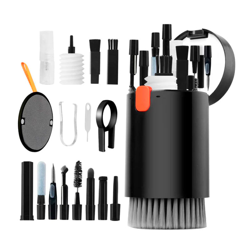 El kit definitivo para dejar tu tecnología impecable, donde sea y cuando sea. El kit de limpieza 20 en 1 es la solución integral para mantener limpios y en perfecto estado tus dispositivos electrónicos, audífonos, teclados, pantallas, cámaras y más. Compacto y portátil, incluye múltiples herramientas adaptadas a diferentes superficies y necesidades. Material: Plástico ABS + cerdas suaves + esponjas + microfibraTamaño Aprox. producto: 9 x 6 x 6 cm.Empaque: 10 x 6.5 x 6.5 cm.Peso: 128 g.Dile adiós a la mugre en tus audífonos Limpia cada rincón con precisión. ¡Sonarán como nuevos!Teclado limpio, mente tranquila Elimina polvo, migas y grasa en segundos. Pantalla y puertos como recién comprados Incluye herramientas delicadas para limpiar sin dañar. Diseño compacto y portátil Todo en un solo estuche elegante. Llévalo donde quieras.20 herramientas en 1 solo producto Cepillos, pinzas, soplador de aire, spray, y más. ¡Versatilidad pura! Contenido del paquete:Brochas de diferentes tamañosPunta para limpiar audífonos internosPinzasHerramienta para quitar teclasEsponja suave para pantallasPluma de limpieza retráctilPalo de esponjaAlmohadilla para pantallasRemovedor de suciedad en puertosAtomizador (rellenable Ventajas destacadas:Ideal para limpiar auriculares, teclados, cámaras, pantallas, celulares y más.Diseño compacto y todo en uno, fácil de transportarHerramientas resistentes y seguras para todo tipo de superficies.Estuche con compartimientos organizados y tapa protectoraMejora la higiene y prolonga la vida útil de tus dispositivos.**ANTES DE REALIZAR CAMPAÑA VERIFICAR DISPONIBILIDAD COMPLETA** GARANTIALa garantía del producto debe estar vigente.La garantía no cubre productos que presenten avería por mal uso del cliente, descuido o no seguimiento de las instrucciones.El daño del producto debe ser por un defecto de fabricación, falla técnica o irregularidad.El producto debe estar nuevo, sin abrir, sin uso, con todos sus empaques originales, piezas, accesorios, manuales completos y etiquetas adheridas al mismo.Para toda devolución es fundamental el empaque original pues es tan importante como el producto mismo; manipúlalo con el mayor de los cuidados, de esta forma no tendrás ningún inconveniente al momento de realizar la devolución.Dentro de un periodo no mayor a 2 días hábiles después de haber recibido tu pedido toma fotografías de los daños de forma que puedan percibirse con claridad. Procura capturar diferentes ángulos del daño en donde se observe claramente el empaque en sus diferentes costados y el producto con todas las piezas recibidas.Reportar la novedad por avería máximo a los dos días siguientes a la fecha en la que recibió el producto, deberá comunicarse a través de los canales de contacto habilitados para radicar la reclamación.Una vez el área de Servicio al Cliente reciba la solicitud junto con los soportes enviados, se determinará el trámite a continuar de acuerdo con las evidencias de la avería y la fecha de reporte de la novedad. * Aplica derecho de Retracto*garantiza que usted pueda terminar un contrato de compraventa a su sin que el proveedor deba estar de acuerdo o se lo permita, es decir, es una facultad para que usted como comprador pueda arrepentirse o “echarse para atrás” después de la compra de un producto o de un servicio.